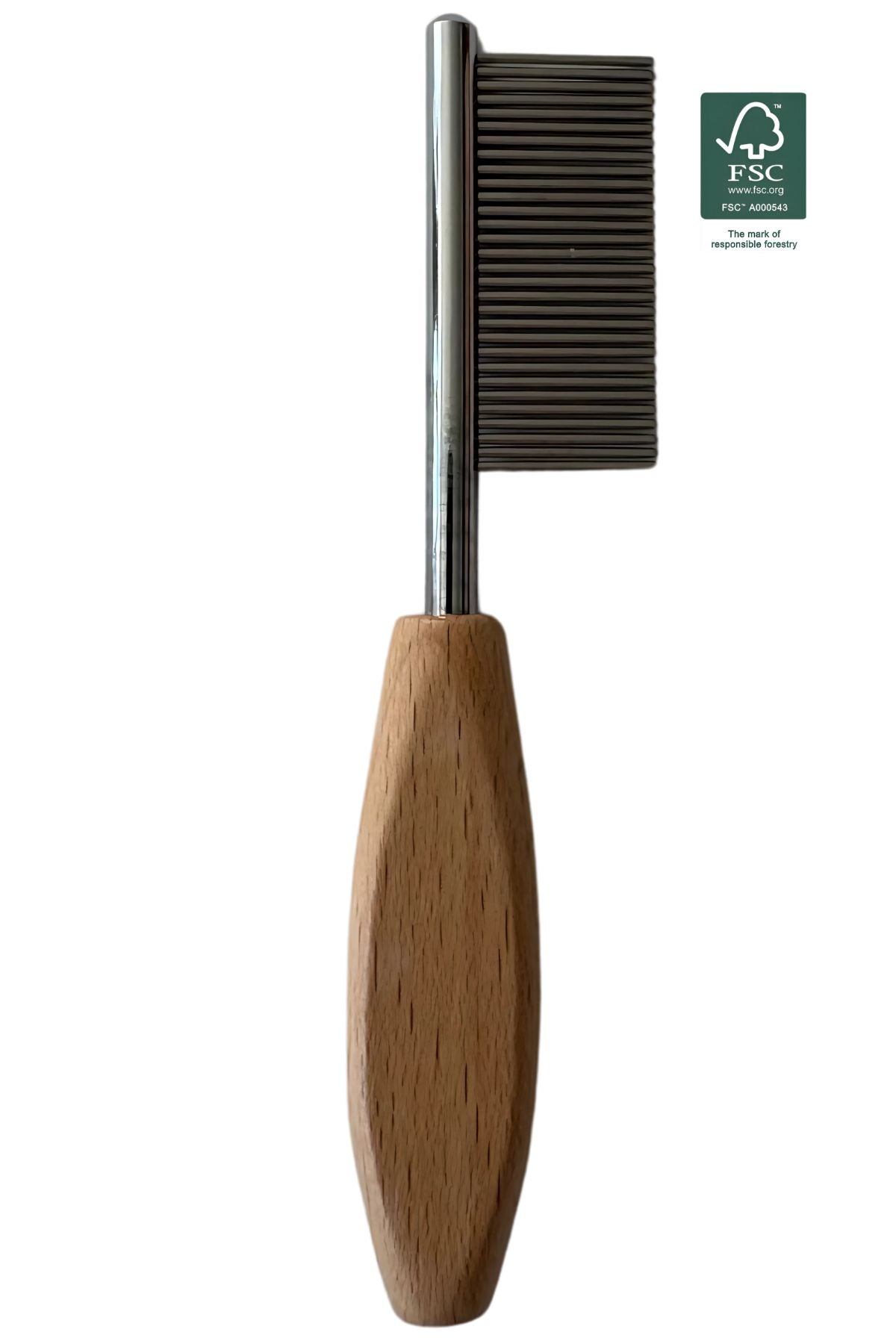Het gecertificeerde berkenhouten handvat ligt comfortabel in de hand, waardoor je de kam eenvoudig en efficiënt kunt gebruiken. Deze kam is ideaal voor honden met een gevoelige huid en is perfect voor het behandelen van kleinere gebieden, zoals het gezicht en de oren.