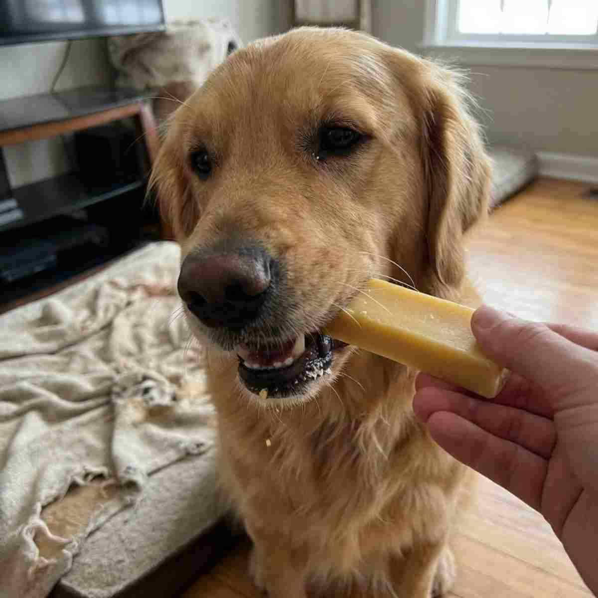 Verwarm kleine, overgebleven restjes van 2 tot 3 cm in de magnetron voor 60 tot 90 seconden. De stukjes kaas zetten uit en worden onweerstaanbaar knapperig. Laat ze goed afkoelen om ze veilig te kunnen geven.