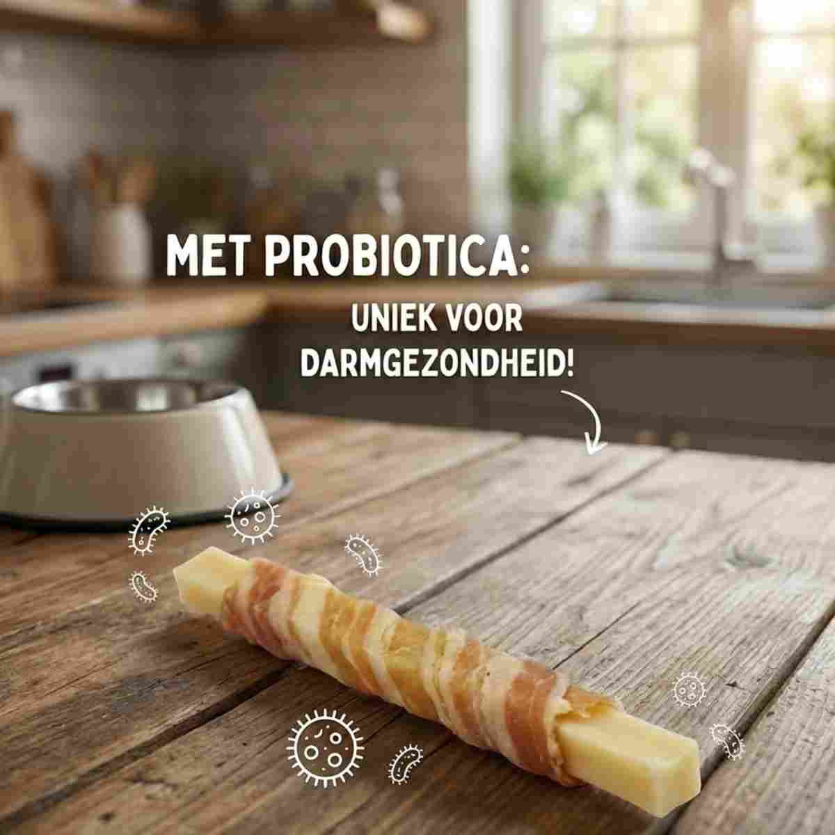 Deze kaasstaaf bevat als enige probiotica (Lactobacillus & Bifidobacterium): goede, levende bacteriën die de darmgezondheid en spijsvertering van je hond ondersteunen.