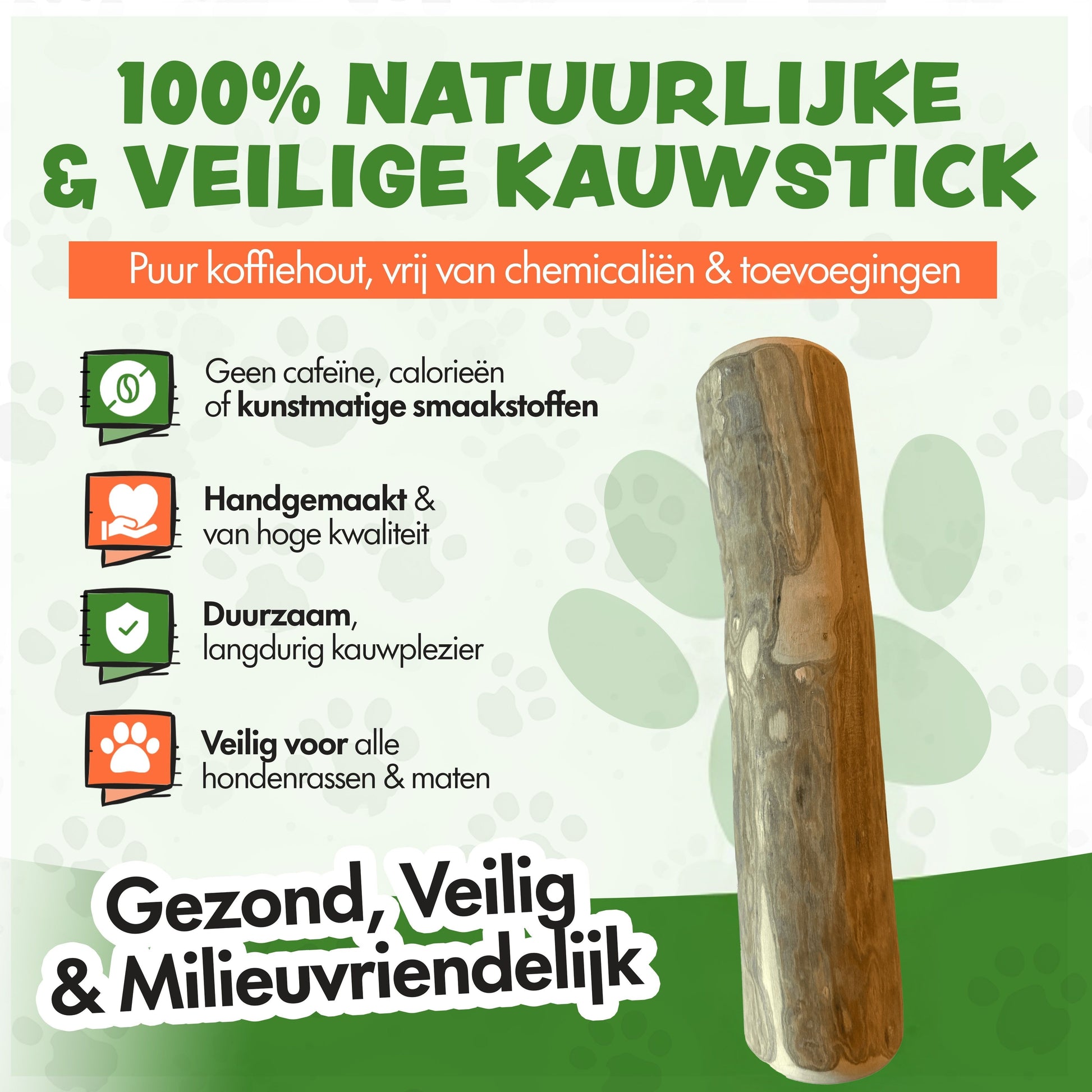 - Duurzaam en Milieuvriendelijk: De koffiehout kauwstaaf is een milieuvriendelijke keuze voor bewuste hondeneigenaren. Dit product is handgemaakt en biedt een duurzaam alternatief voor traditionele kauwbotten.